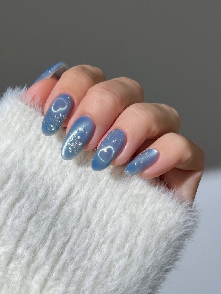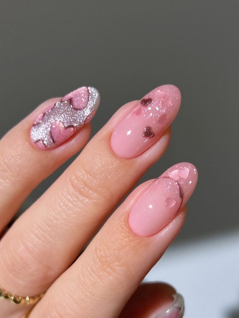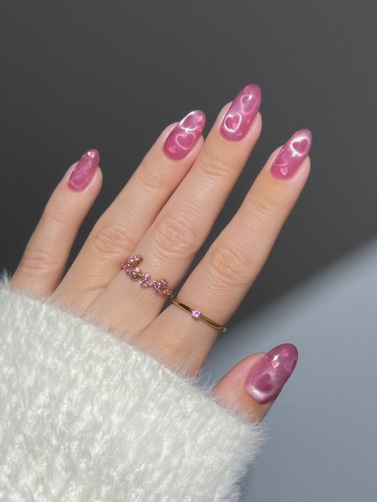 The difference now is polish. Miniature hearts aren’t slapped on; they’re carefully spaced, often layered over sheer or milky bases that keep the look light. Embossed heart designs bring a tactile, almost jewel-like quality, especially when paired with velvety backgrounds in pinks and reds. Metallic heart manicures—chrome silvers, molten golds, deep ruby foils—add a graphic edge that reads bold.