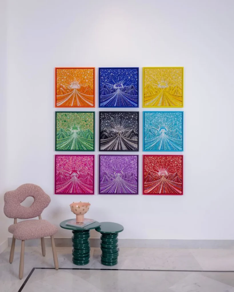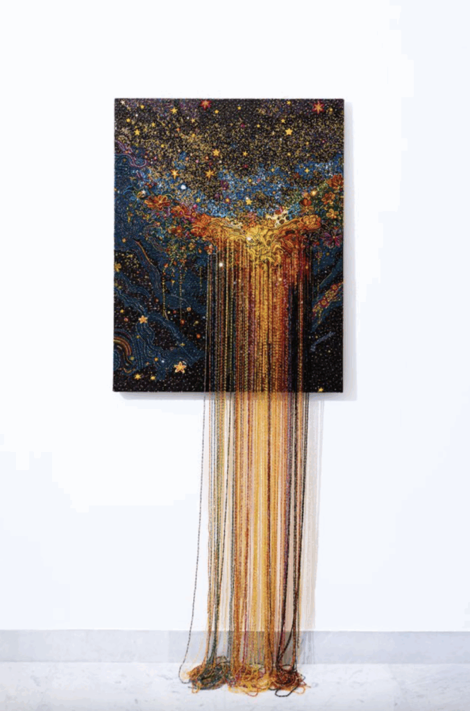 The exhibition feels like a constellation in motion. Pieces such as Cosmic Waterfall shimmer with glass beads that cascade beyond their frames, while Chromium, composed of nine chromatic panels, shifts color like an aurora trapped on canvas. Each artwork draws on techniques that Kadi honed in his atelier — embroidery, crystal appliqué, and meticulous layering — but here they take on new meaning. The materials once used to ornament dresses now narrate the evolution of light itself. Nowhere is this more evident than in The Four Seasons of Light, a luminous centerpiece that charts the passage from darkness to rebirth through gradients of radiance.