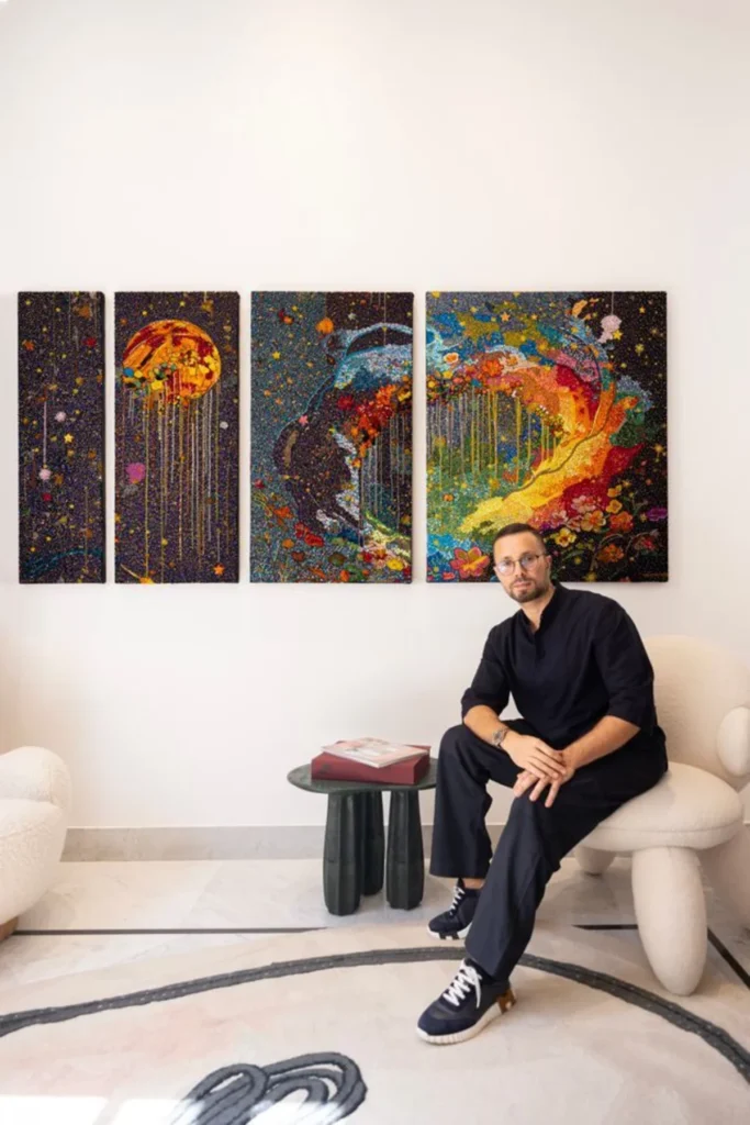 Rami Kadi’s latest exhibition, Blooming Universe, on view at Diana Ghandour Studio in Beirut, is not a detour from fashion but an extension of it. Presented in collaboration with Belvedere Art Space, the show continues the designer’s exploration of cosmic storytelling that began with his 2023 debut collection Highway to Heaven. Across 22 intricate works, Kadi pushes the language of couture beyond the body and into the realm of fine art, where fabric, crystal, and thread construct galaxies instead of gowns.