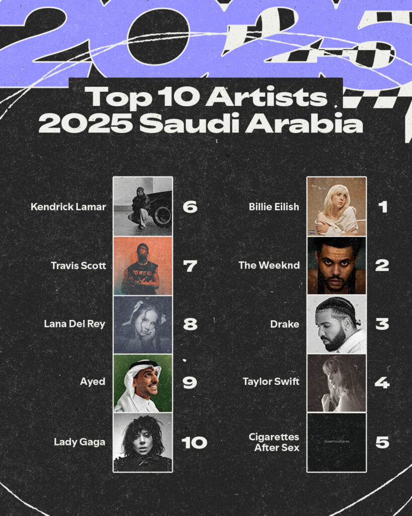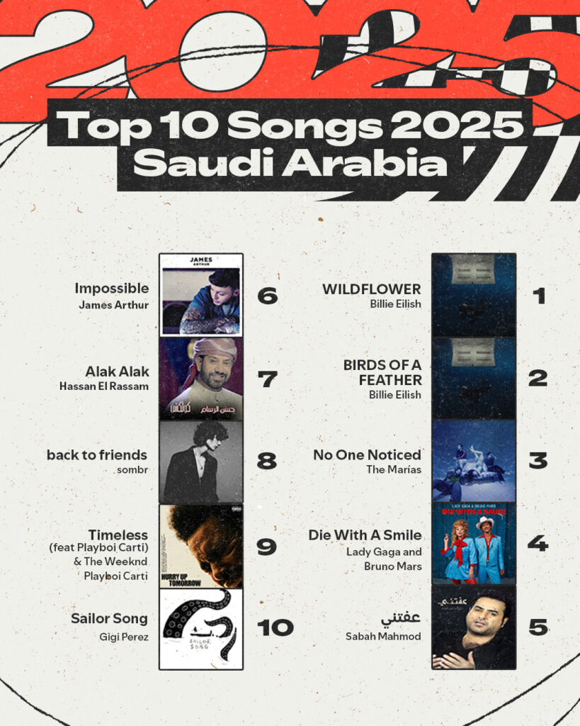 Billie leads Saudi Arabia’s overall artist chart, her sound striking a balance between softness, mood, and emotional intensity.