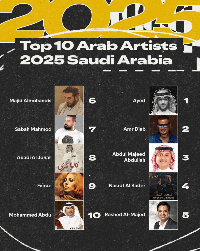 Ayed tops the list for the second year in a row, proving his voice continues to define the Kingdom’s musical taste.