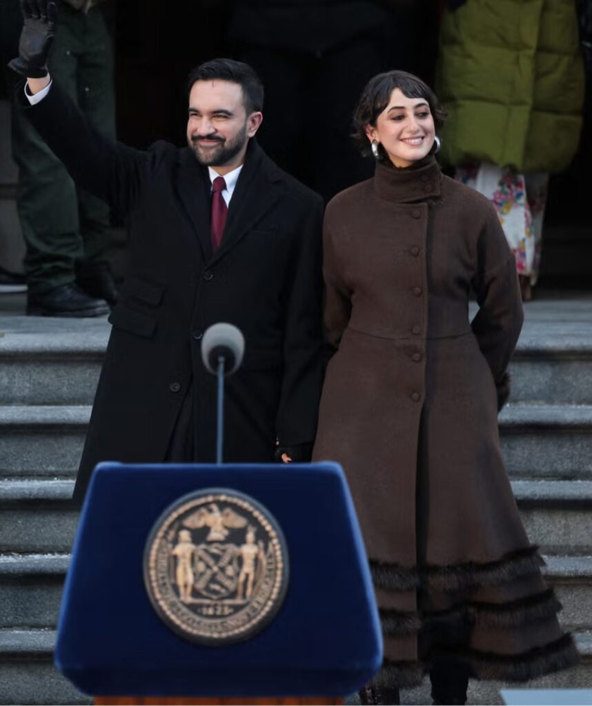 Zohran Mamdani was sworn in as New York City’s 112th mayor to a crowd that reportedly reached into the tens of thousands, underscoring the momentum behind his people-powered campaign. At 34, Mamdani becomes the city’s first Muslim mayor and its first South Asian and African-born leader, marking a historic shift in representation. Fashion also played a quiet role in the moment, with First Lady Rama Duwaji drawing attention for wearing a custom coat by Palestinian-Lebanese designer Cynthia Merhej‘s brand Renaissance.
