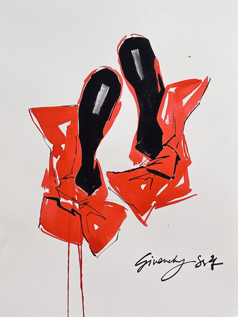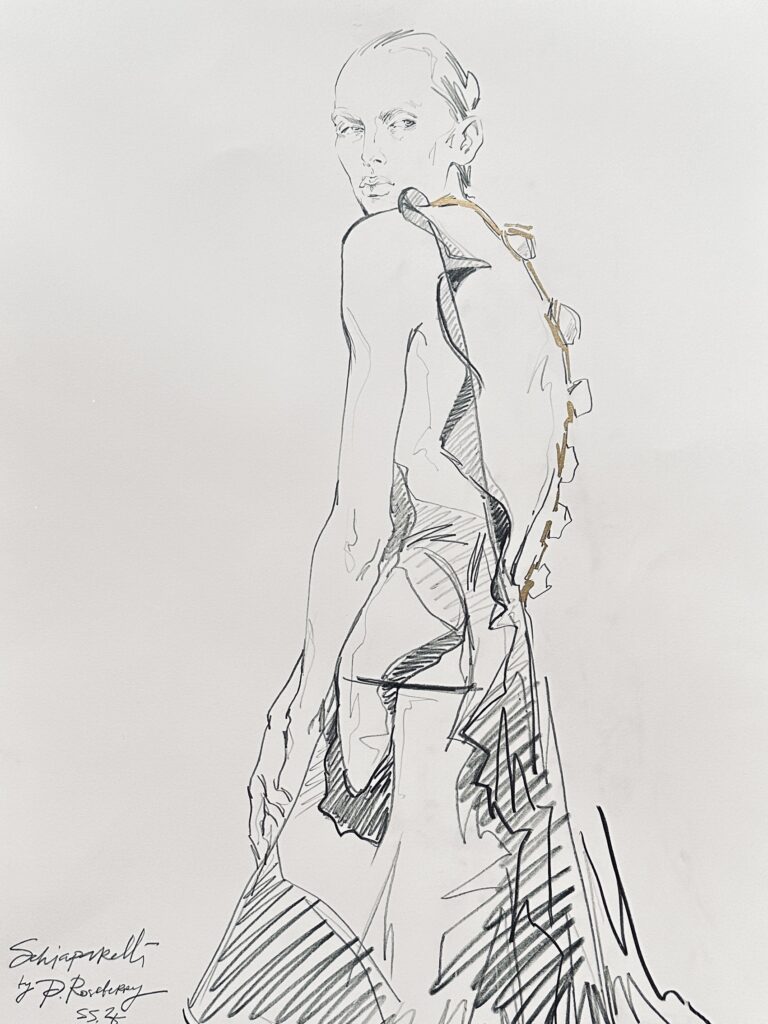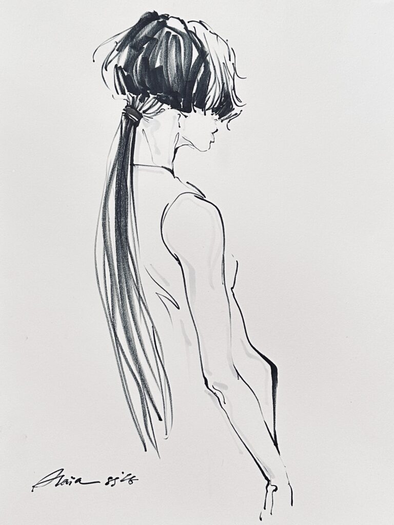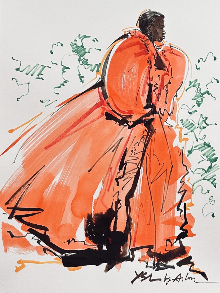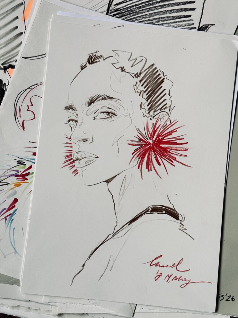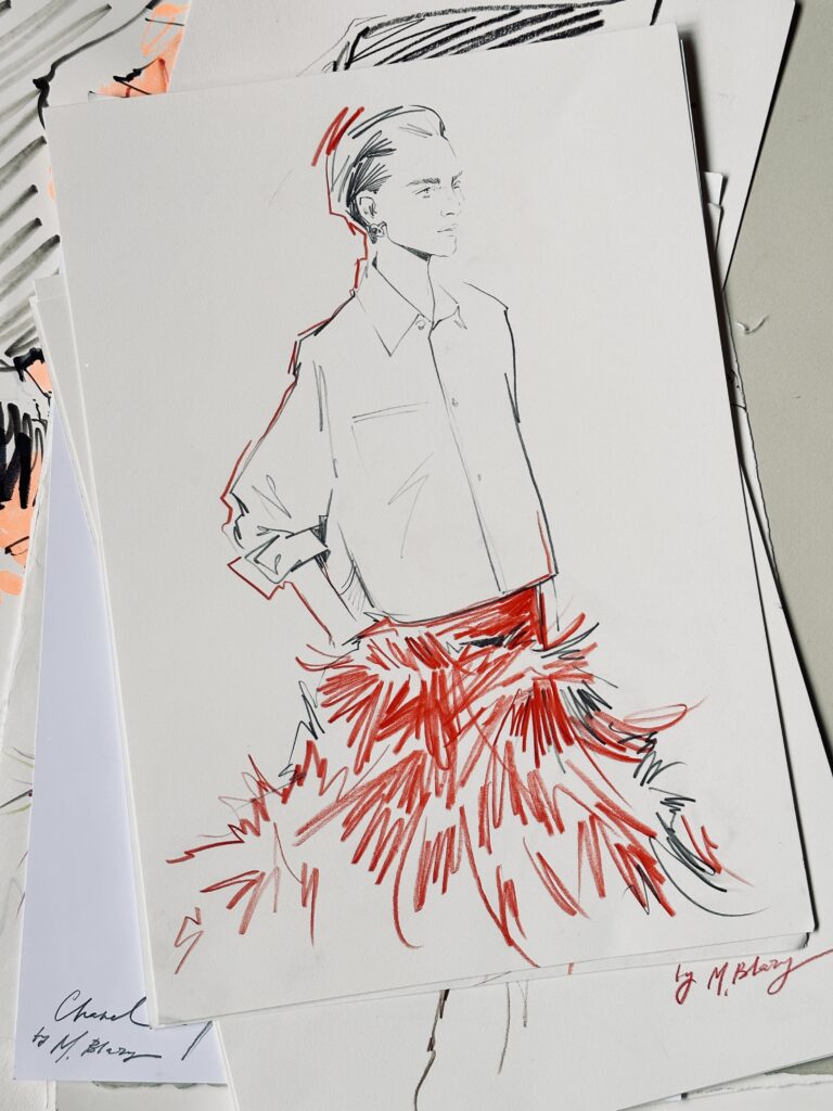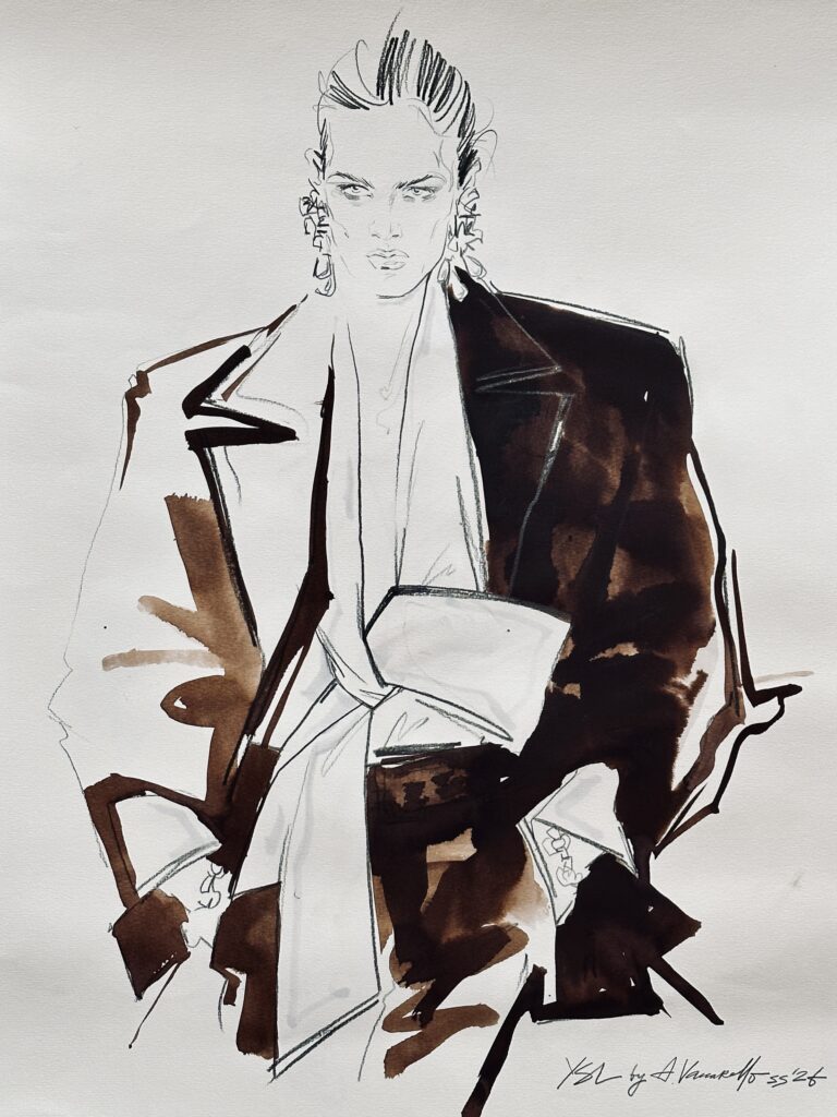 A seasoned artist who began her journey in fashion retail before working alongside the likes of Naomi Campbell, Cindy Crawford, and Eva Herzigova, Lavdovskaya’s relationship with fashion has never been distant. She has seen the pulse of backstage chaos, the rhythm of fittings, the unguarded seconds before a model steps onto the runway. Her sketches—alive with movement and feeling—capture its essence.