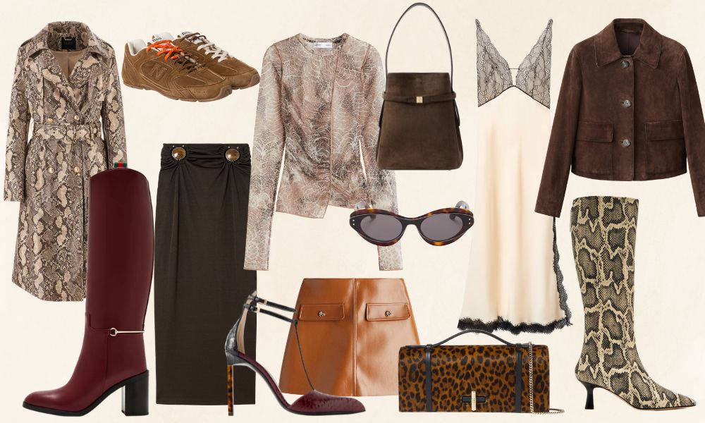 Slip dresses and cami tops in lace lead the way, turning classic lingerie details into statement looks. Animal print shoes, especially boots, add a fierce edge to everyday styling. The controversial yet seriously trendy “sneakerinas” (a hybrid of ballet flats and sneakers) are holding top spots on the trend charts, proving comfort and style can finally coexist. Suede jackets bring soft structure, the kind of outerwear that only gets better with wear. Burgundy, browns, and olive greens anchor the season’s palette, adding depth and warmth to every look. Together, these essentials shape a fall wardrobe that feels confident, modern, and ready for the months ahead.