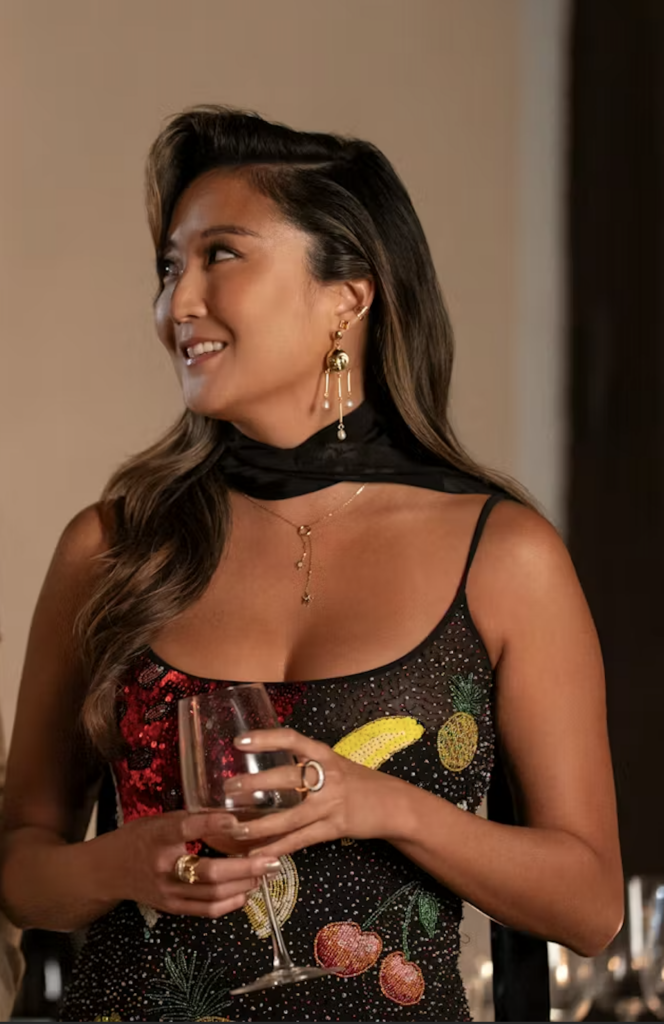 Mindy’s role as the show’s most expressive dresser becomes fully realized this season. Her wardrobe leans unapologetically theatrical, yet it never feels careless. Sequins, embellishment, saturated color, and dramatic silhouettes are deployed with confidence rather than irony.