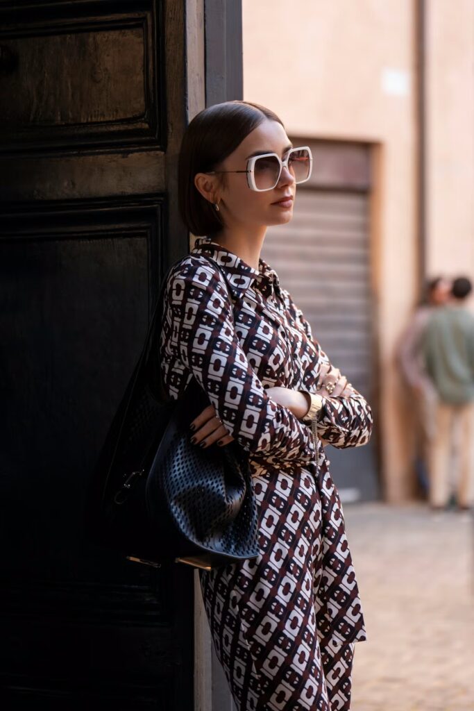 Emily’s wardrobe this season still embraces pattern, color, and playful contradiction, but it does so with more control. In Rome, her fondness for prints is tempered by stronger silhouettes and more strategic styling. Dolce & Gabbana florals, Moschino polka dots, and tailored Italian separates appear repeatedly, often anchored by one consistent accessory. The Fendi ‘Baguette,’ created specifically for the show, becomes a visual constant that reins in otherwise busy compositions.