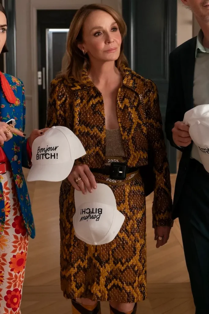 Sylvie’s wardrobe continues to operate in a different register entirely. Where Emily experiments, Sylvie asserts. Her looks in season five are precise, architectural, and unwavering in their message. Alaïa, Ferragamo, Vivienne Westwood, and Alberta Ferretti form a disciplined rotation, with clean lines and sculptural forms doing the heavy lifting.