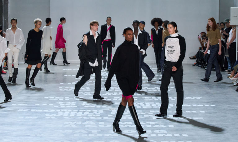 This collection embraces lightness through fabrics like silk twill, organza, and crumpled cotton, which add softness and movement. The striped cotton pajama suit and airy organza pieces offer a playful take on traditional silhouettes, transforming them with a sense of ease and lightness. One of my favorite textures is the intricate jacquard denim effect in knitwear, where our iconic blockchain motif creates a striking contrast between solid and void. It’s a surprising element that feels almost architectural in an otherwise fluid, organic collection, bringing a touch of structure to the dreamlike vision.