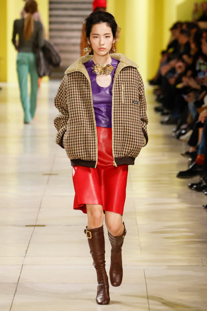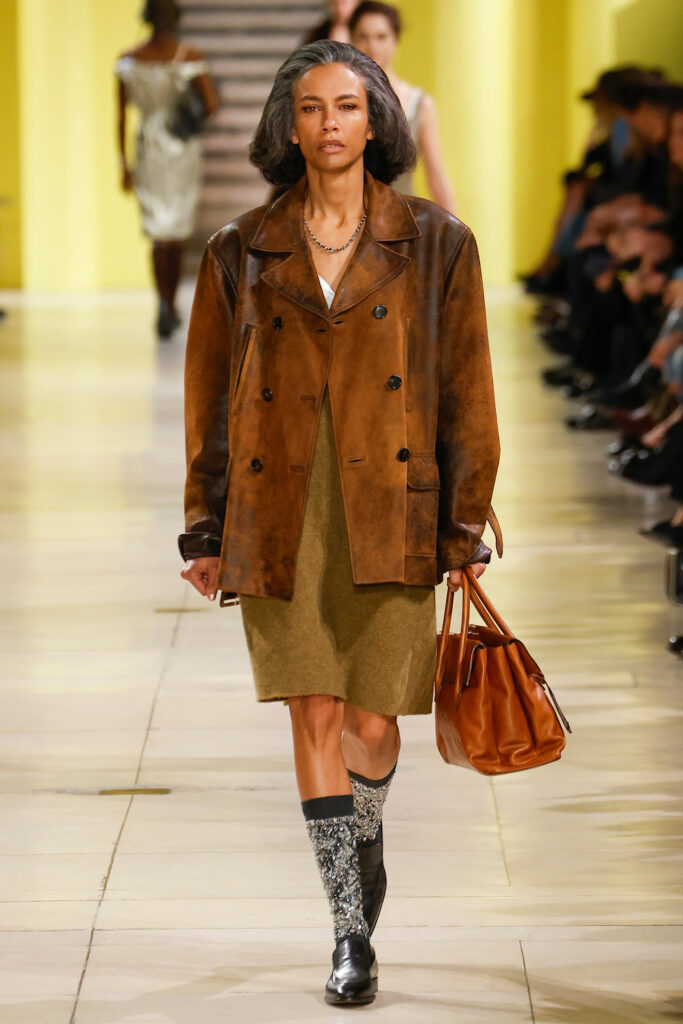 Prada’s Spring/Summer 2026 collection followed the same ethos, turning layering into an art form. Workman jackets over shift dresses, bubble-hem skirts under cardigans, pastel leather gloves paired with utility pieces, every combination felt like a choice made with intention. Prada proved that style isn’t just what you wear; it’s the conversation between pieces, textures, and eras.
