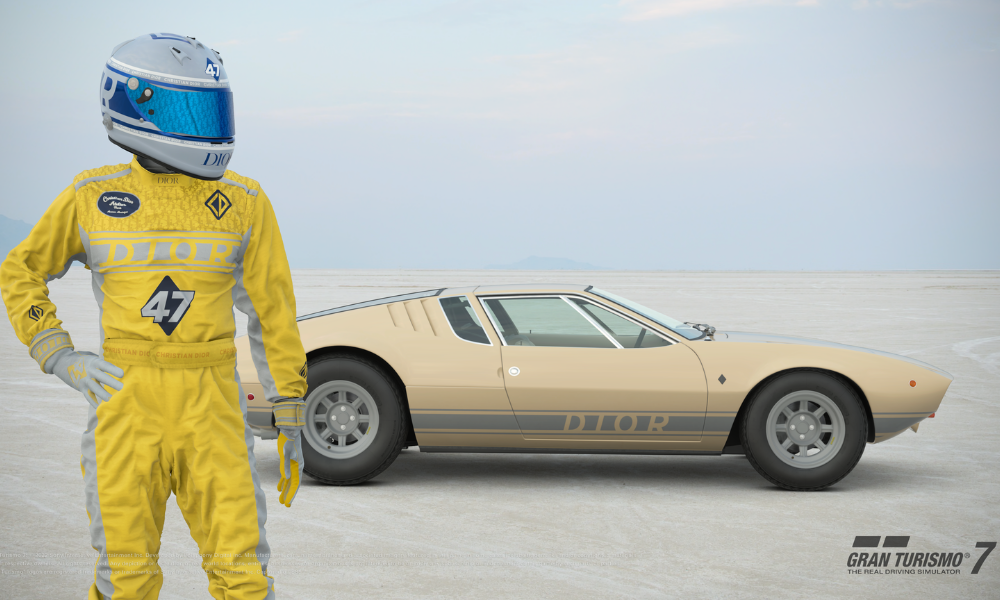 The menswear Creative Director has designed new ground-breaking Dior gear – or ‘skins’ if you will – for the Gran Turismo 7 video game. The inaugural virtual capsule consists of a whole ‘fit: a yellow and gray jumpsuit, matching gloves, reimagined Diorizon shoes and a blue and gray helmet to match a customised vintage car, the De Tomaso Mangusta.