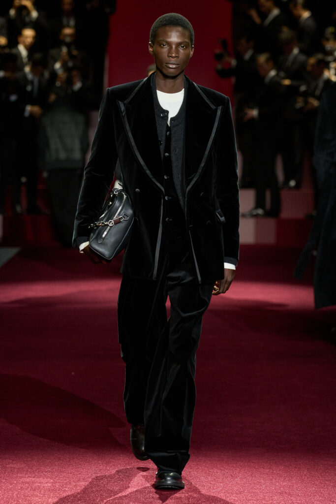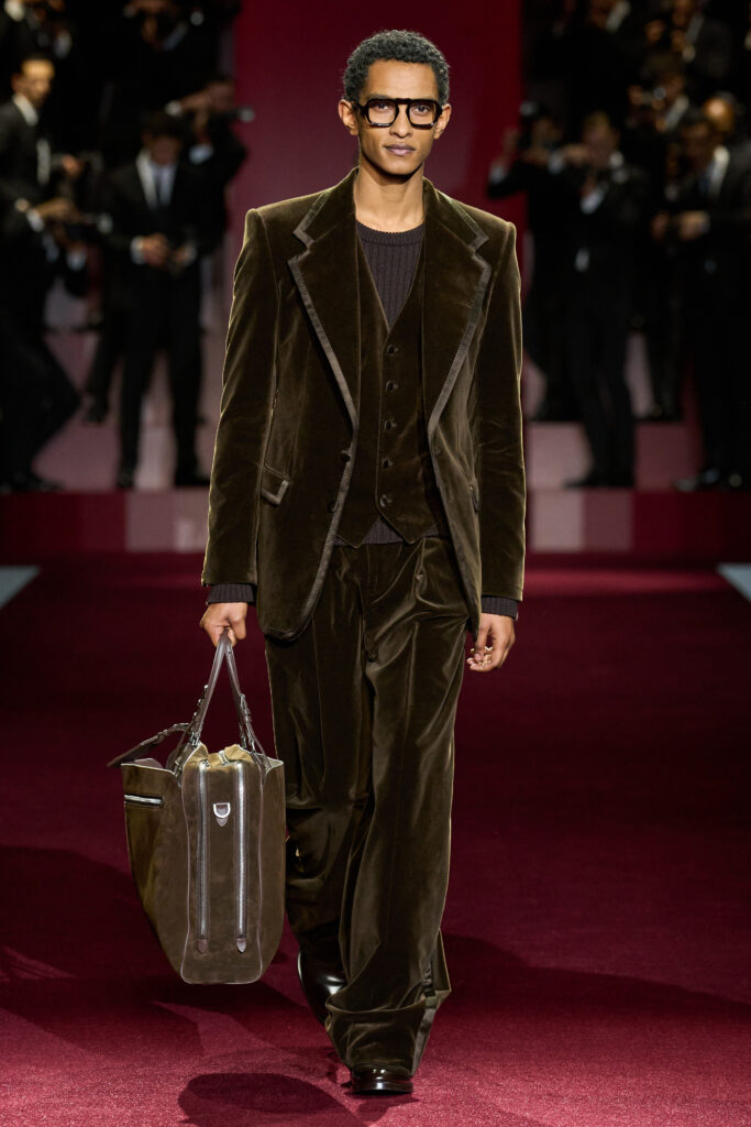 Emporio Armani & Hermès’ sophisticated take introduced velvet suits in a rich palette of earthy tones, lending everyday wear an unexpected gravity. Dolce & Gabbana, never shy of theatricality, leaned into the fabric’s natural drama with sharply cut blazers and shorts that shimmered under the light, a reminder that masculinity need not retreat from opulence.
