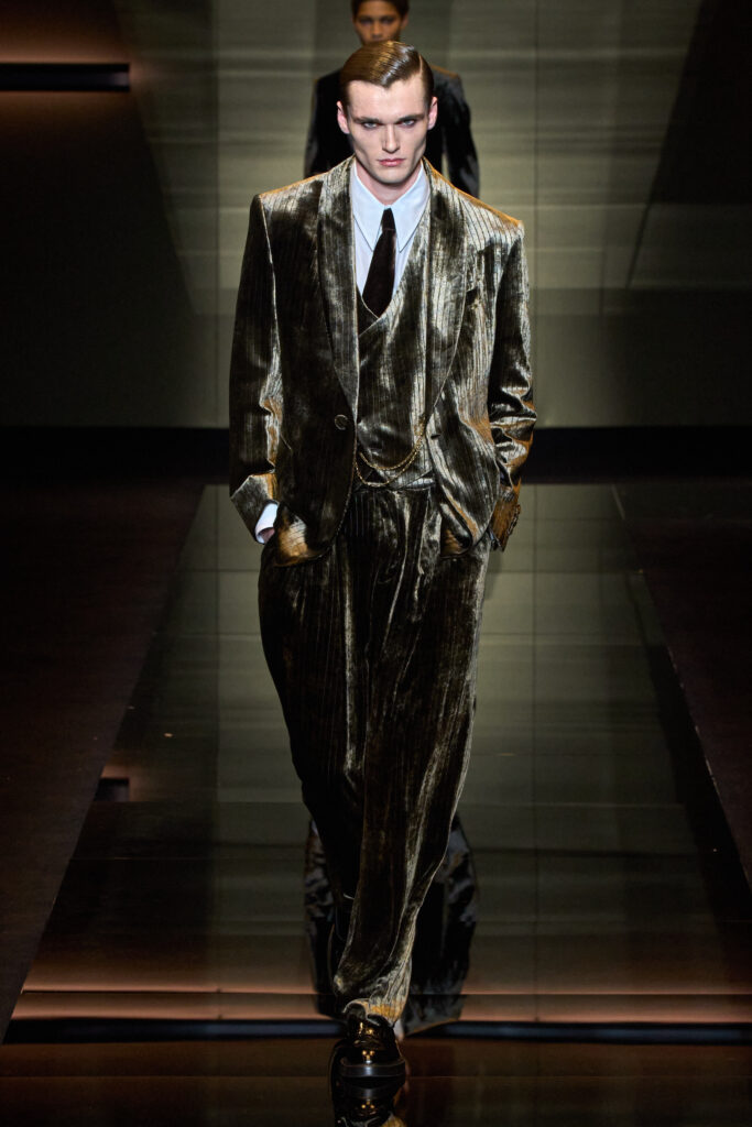 Velvet has always carried a complex cultural weight. Its softness belies strength; its history—woven through Renaissance courts, 1970s bohemia, and 1990s rock star wardrobes—reflects a material both decadent and democratic. Giorgio Armani’s velvet jackets and trousers, for instance, epitomize how the house continues to incorporate texture into the male wardrobe.