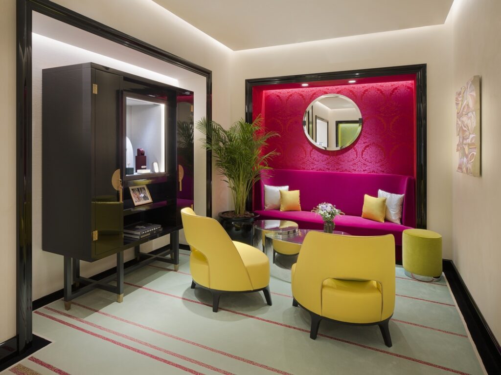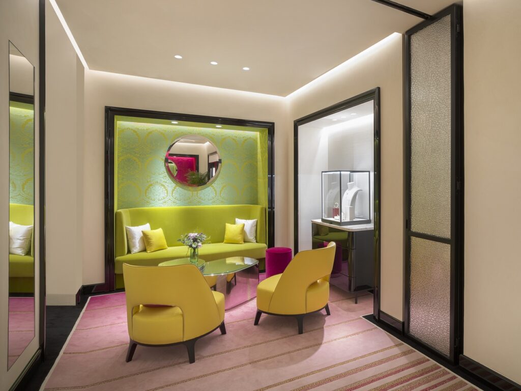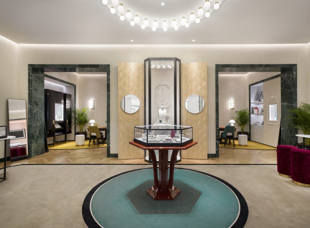 Inspired by the Maison’s historic home at 26 Place Vendôme, the boutique dazzles with a façade of glass prisms in Boucheron’s signature green, reflecting light in a mesmerizing dance of luxury. Inside, Art Deco influences meet natural beauty, from wallpaper inspired by ancient Chinese florals to rich fabrics by Rubelli that shimmer with metallic hues.