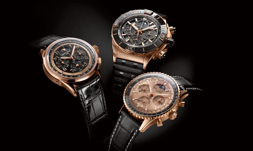 Each timepiece comes in a luxurious, suede-lined wooden box with compartments for up to three watches, a removable travel pouch, and a special copy of Breitling: 140 Years in 140 Stories by Rizzoli.