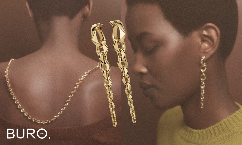 The collection includes two necklace variations, each with unique volumes perfect for layering, while the versatile bracelet can be worn solo or stacked. Rings and earrings showcase the chain motif in both minimal and elongated designs, allowing for a chic, contemporary look whether worn as a set or individually.