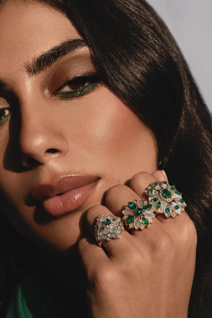 Crafted in 18K gold and adorned with diamonds, emeralds, rubies, and sapphires, each piece tells a story of identity, artistry, and pride. The magic lies in its delicate balance, mother-of-pearl meets intricate Arabic motifs, creating designs that feel both ethereal and empowering.