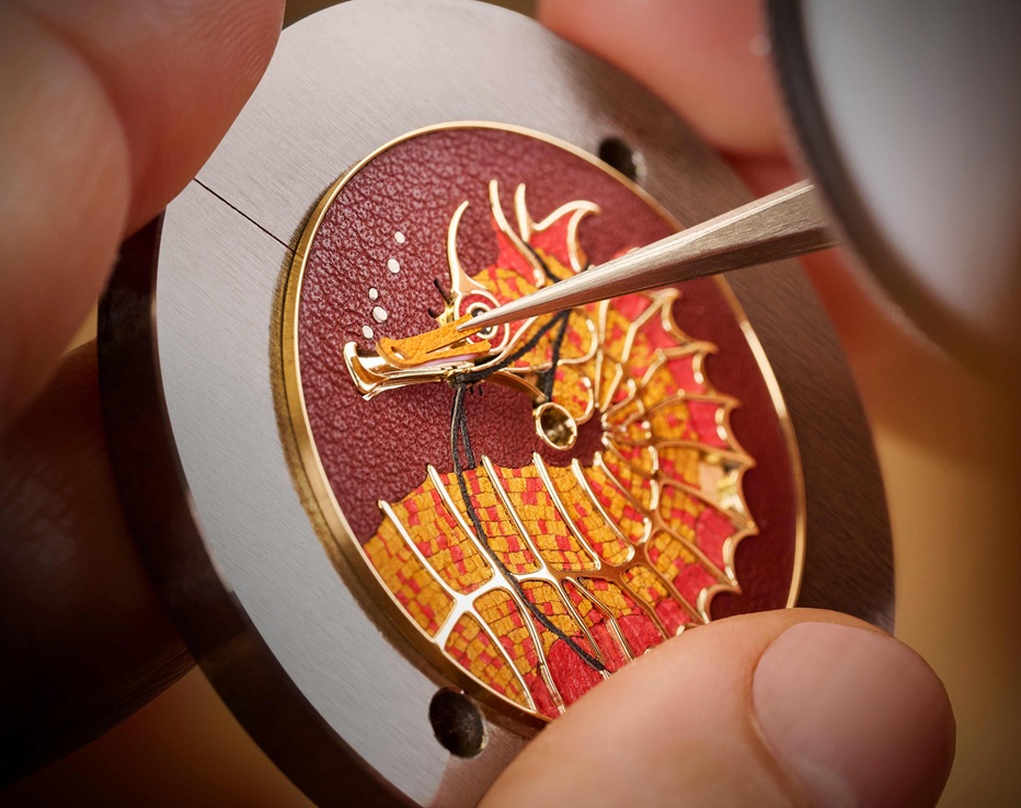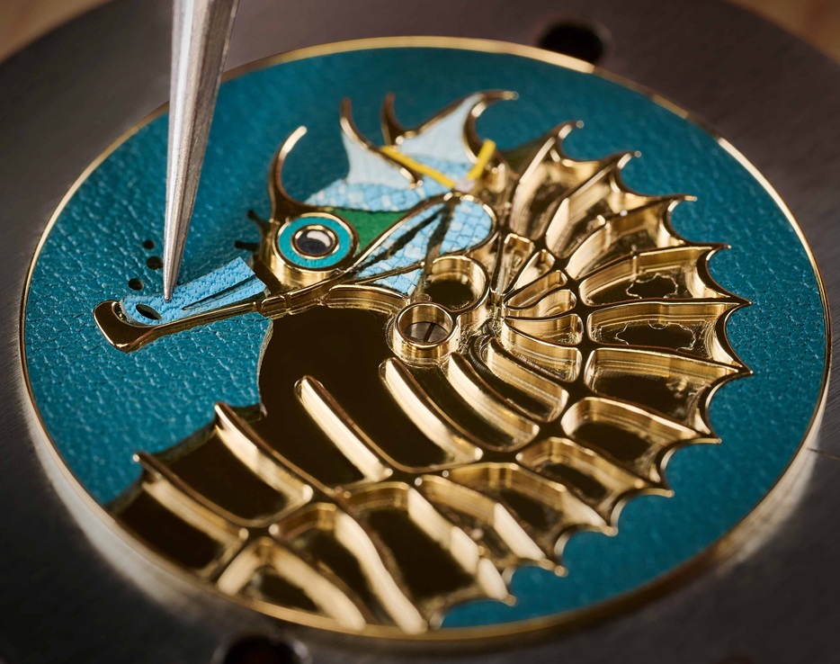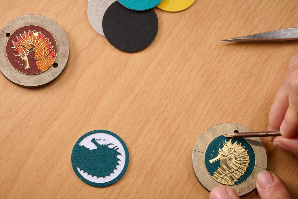 The Slim d’Hermès line, first introduced in 2015, has always embraced understatement, but here its clean geometry becomes a canvas for exuberant artisanal expression. The watch’s white-gold case, an elegant 39.5 mm, frames a dial where the seahorse’s curves are first traced and sculpted by the engraver, then meticulously filled with a mosaic of leather fragments shaved down to an extraordinary 0.5 mm thickness.