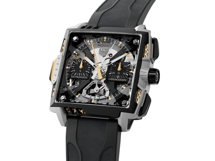Inspired by hypercar aerodynamics, its sculpted Grade-5 titanium case is crafted using Selective Laser Melting, an aerospace-derived technique, resulting in an 85-gram, architectural design featuring twin-layered honeycomb mesh and striking yellow gold and black DLC accents. Inside beats the Calibre TH81-00, TAG Heuer’s most complex chronograph movement to date, boasting a 65-hour power reserve, rattrapante (split-seconds) functionality, and a sapphire caseback with checkered-flag finishing, a mechanical celebration of the brand’s motorsport DNA.