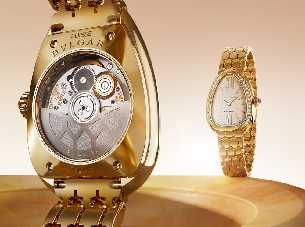 Debuting in the Serpenti Seduttori collection, the movement complements the iconic snake-inspired bracelet and appears in two Serpenti Tubogas models. Its sapphire case back reveals intricate mechanics, while 36 diamonds on the bezel add glamour.
