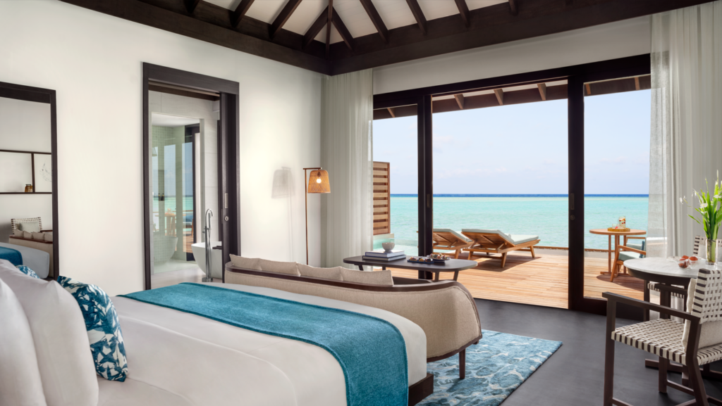 The resort’s villas are a masterclass in Maldivian luxury. Over Water Villas feature traditional coconut-thatch roofs, hardwood floors, and vibrant local fabrics, opening directly onto the lagoon for spontaneous dips. Step it up in a Superior Over Water Villa, perched on the lagoon’s edge for uninterrupted ocean vistas and a private deck perfect for espresso sunrises. The Deluxe Over Water Villa adds expansive space, split-level sundecks, and tubs for two, ideal for sunsets that feel made just for lovers.