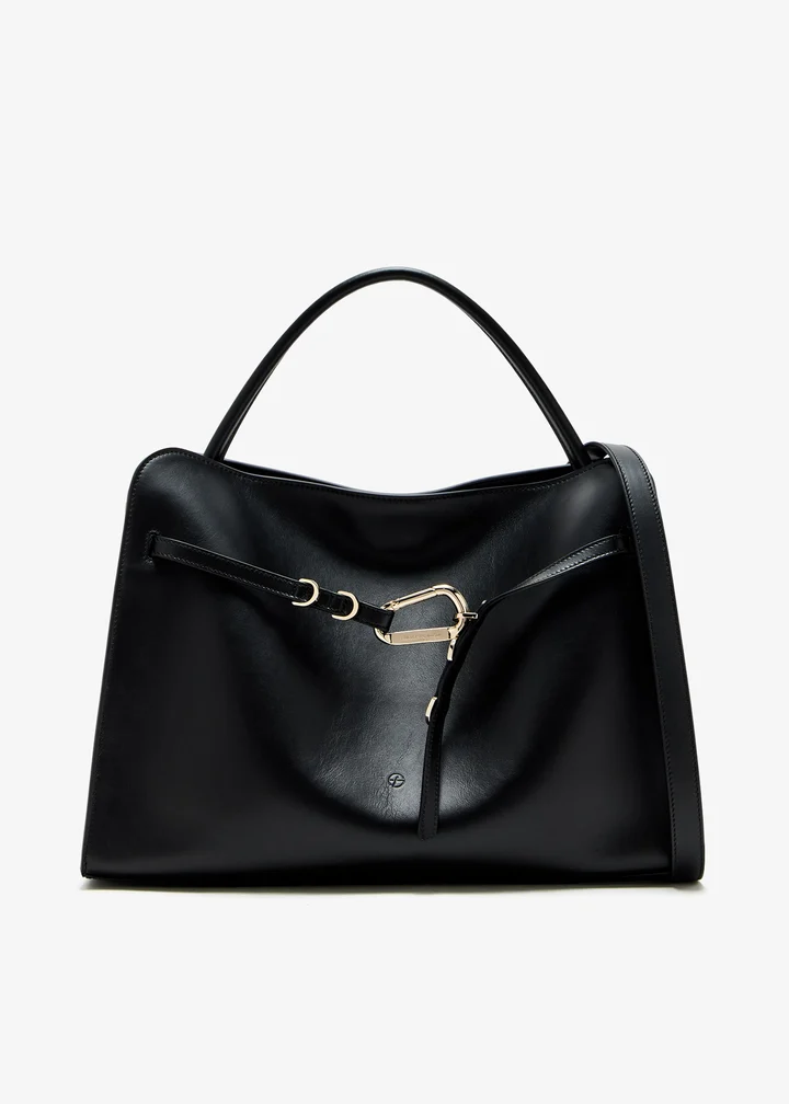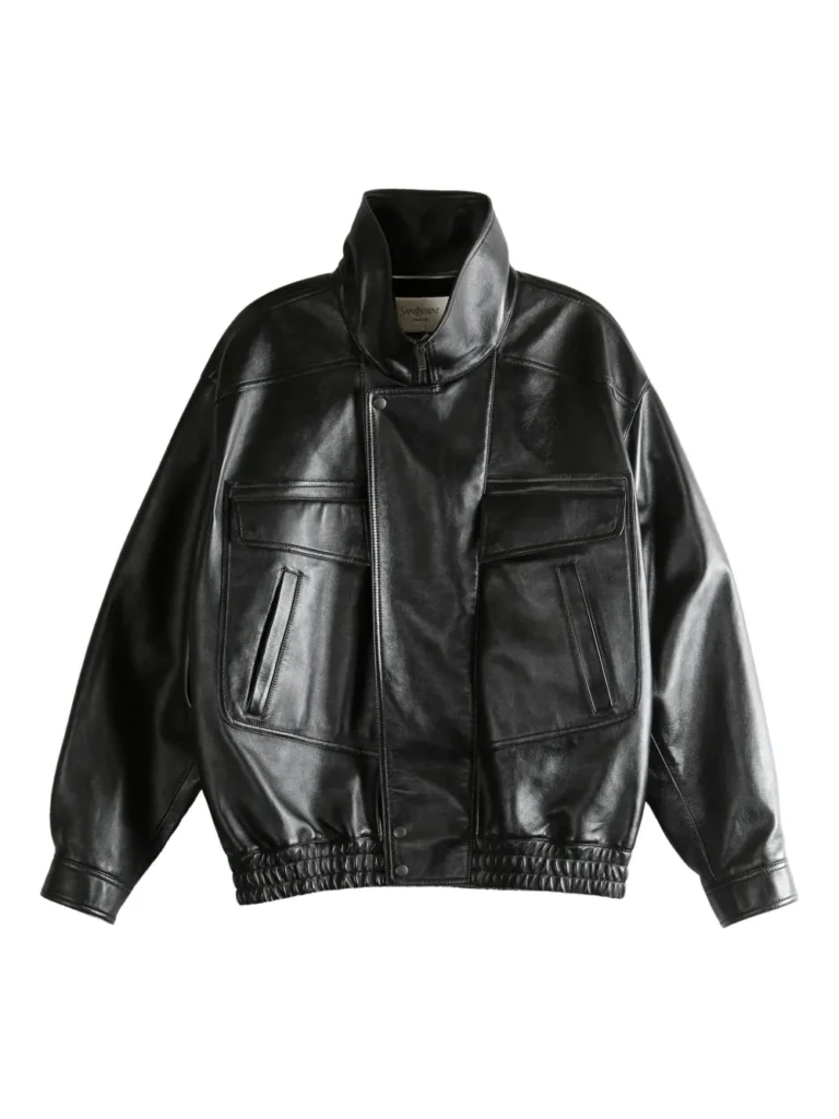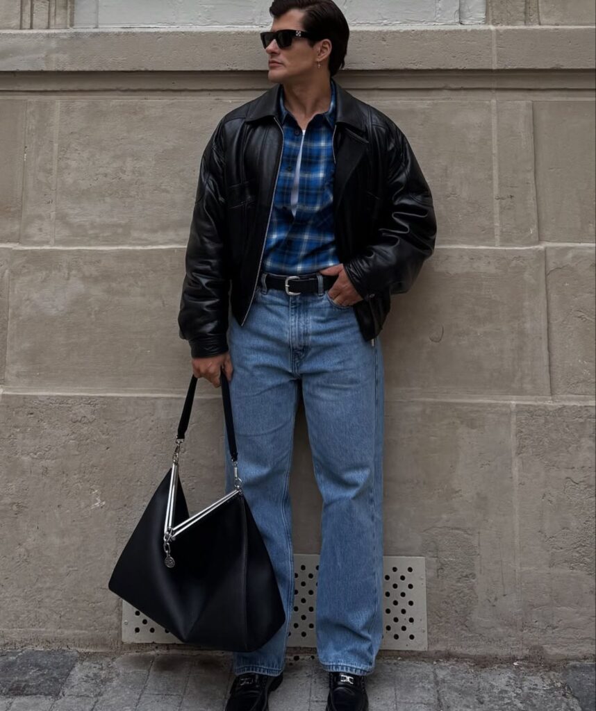 Monday starts with structure. A boxy leather jacket layered over a checked shirt and jeans sets an assertive tone without feeling forced. It’s classic and slightly retro, finished with polished details like black loafers, dark sunglasses, and a carry-all that commands attention.