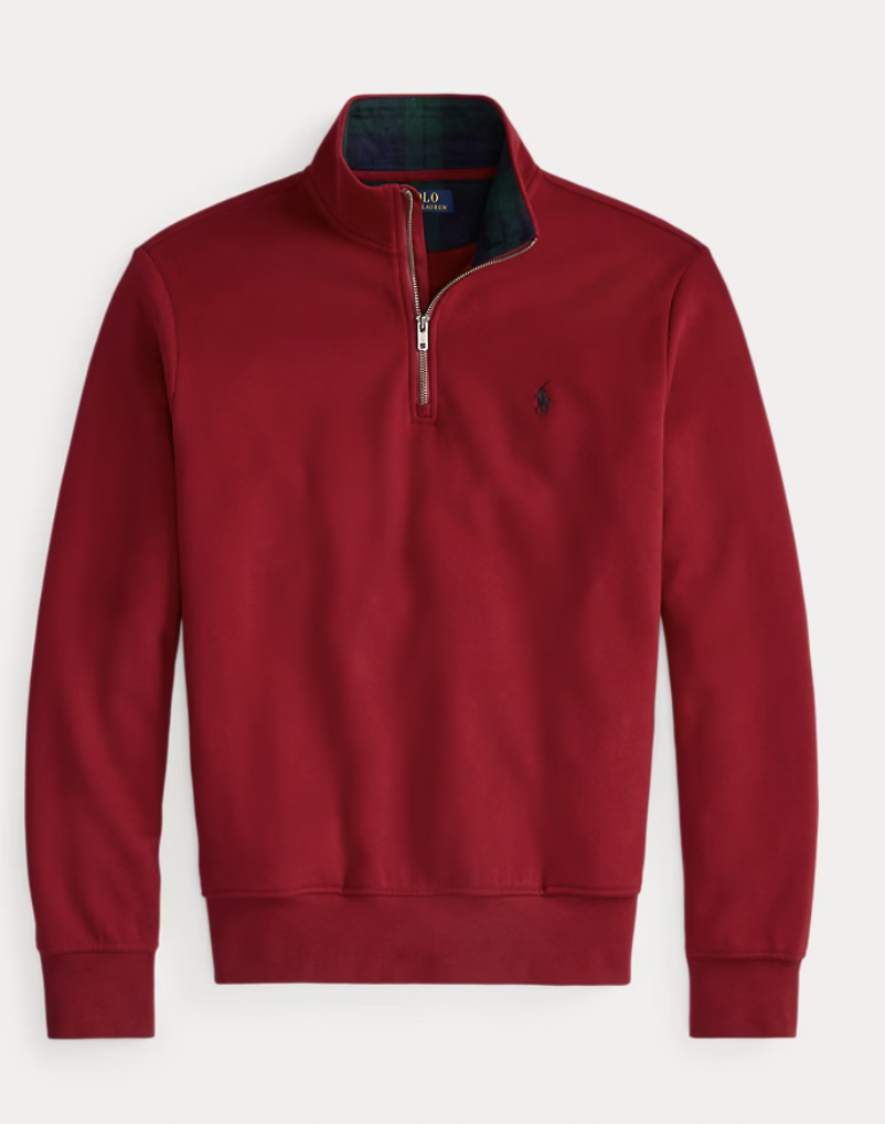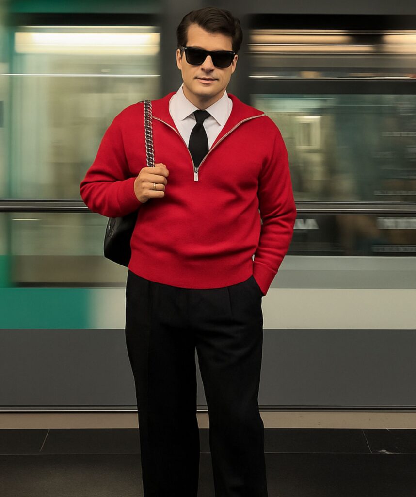 Friday introduces color. A red zip-up knit worn over a shirt and tie is sharp yet casual, proof that bold tones can look composed when grounded in simple tailoring. It captures the energy of movement and modern confidence.