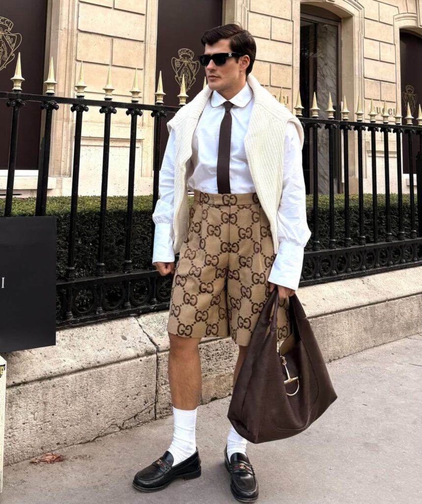 Tuesday channels preppy energy. A crisp white shirt, wide-leg logo shorts, and penny loafers balance playfulness with elegance. The draped knit and narrow tie refine the look, while the high socks add a confident edge that feels deliberate.