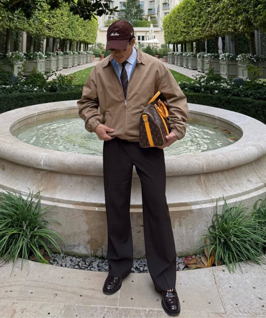 Wednesday brings subtle sophistication. A tan jacket and baseball cap pair seamlessly with tailored trousers and a tie. The look feels equally suited for a coffee run or a business lunch, merging smart dressing with relaxed composure.