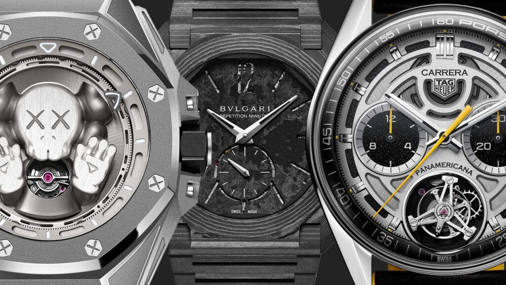 Часы TAG Heuer Carrera Chronograph Tourbillon x Porsche Panamericana, в специальной серии из 255 экземпляров, вдохновлены легендарной гонкой Carrera Panamericana и посвящены 70-летию побед Porsche в ней. Новые часы Ingenieur Automatic 40 от IWC Schaffhausen из коллекции Ingenieur с синим циферблатом как обновленное видение оригинальной модели Ingenieur SL Джеральда Дженты (Gérald Genta) 1970-х годов. Новые часы Octo Finissimo Minute Repeater от Bulgari – ультратонкие механические часы с карбоновым циферблатом и браслетом.