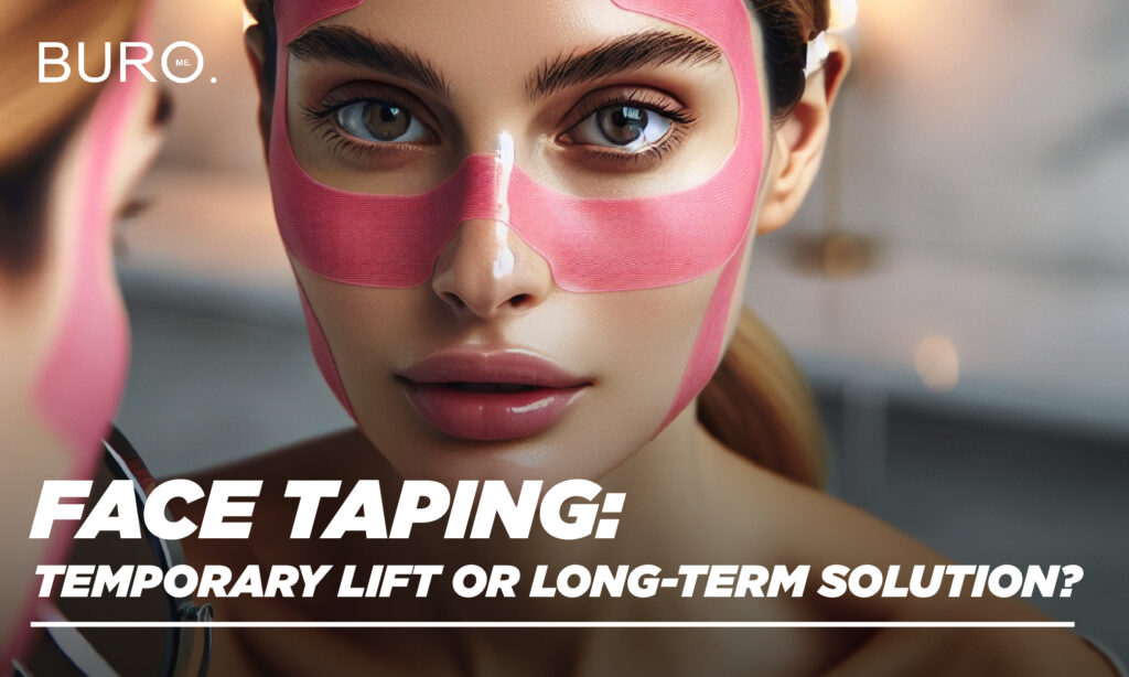 Face taping is a beauty technique in which adhesive strips or tapes are applied to the face to temporarily tighten and smooth wrinkles or fine lines. It is often used as a non-invasive alternative to cosmetic procedures such as facelifts or Botox injections. Face taping has become popular as a quick solution for a more youthful appearance without undergoing surgery.
