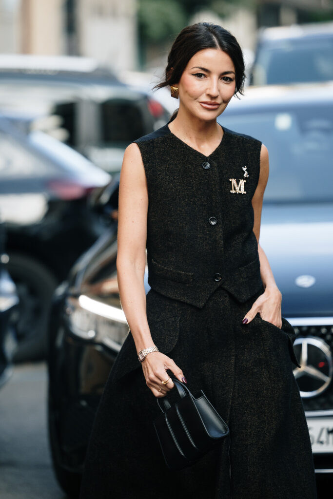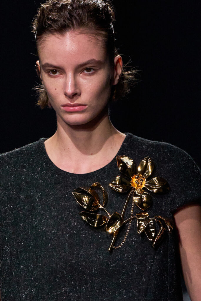 Recently, fashion has been in a maximal mood. We have seen hair bows, rosettes, pearls, and corsages. The next logical step was the brooch. Except this time, it is not behaving like a stiff accessory pinned to a lapel. On the Fall/Winter 2025 runways, designers treated it like a styling tool. Carolina Herrera and Tory Burch sent out sculptural floral pins. Lacoste and Moschino used them to give personality to clean looks. Isabel Marant pinned mixed metals on relaxed boho outfits.