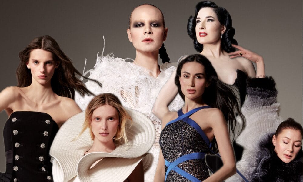 Each silhouette in the collection is a testament to the meticulous artistry of couture, sculpted to accentuate the unique personality of its wearer. From the dramatic drapes of Dita Von Teese’s noir bustier gown to the feathered flourishes adorning Ellen von Unwerth’s tailored tuxedo, every piece is a tribute to individuality and the timeless allure of Haute Couture.