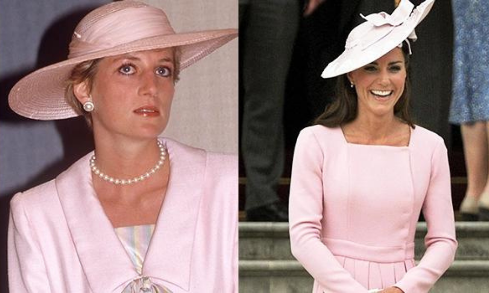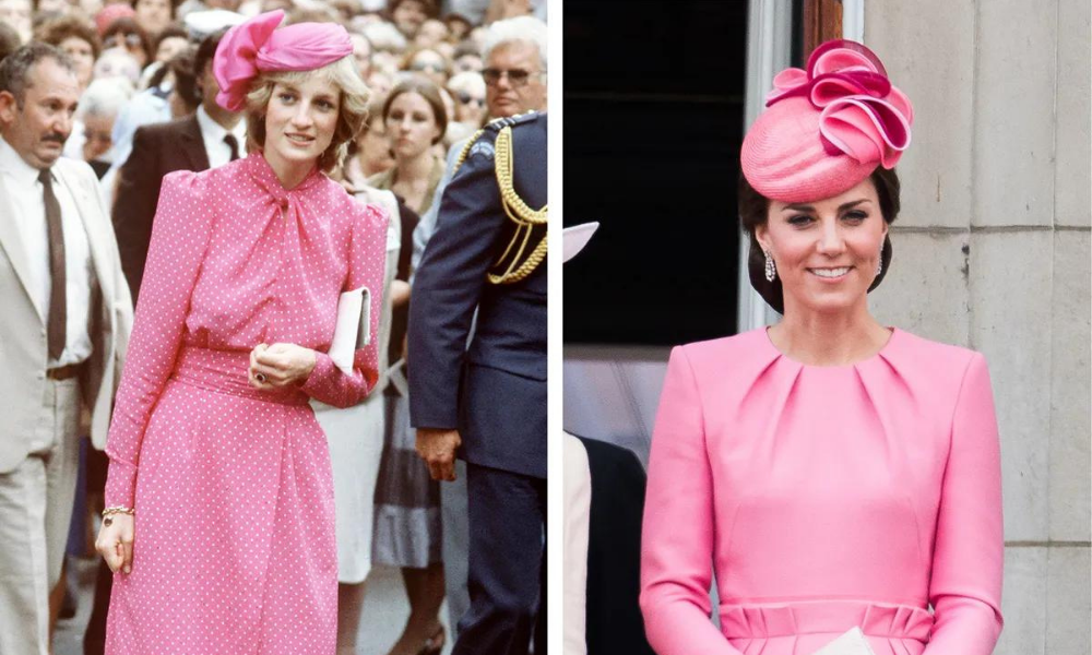 Princess Diana in all-pink ensemble in April 1983 visiting the Freemantle Hospital in Australia; Kate Middleton sporting the same full look while at Buckingham Palace in June 2017.