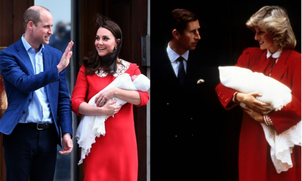 In 2018, Duchess Kate sported a red dress with a white lace collar while leaving the hospital with newborn son Prince Louis; Princess Diana leaving the same St. Mary’s Hospital with newborn Prince Harry in 1984 wearing a red collared dress and coat.