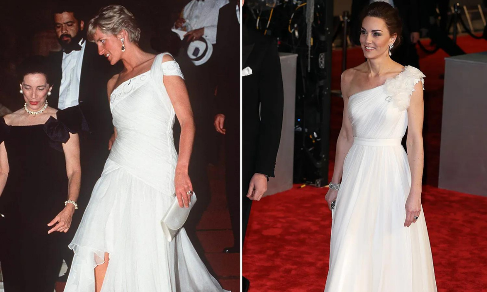 Princess Diana’s masterclass in modern eveningwear in 1991; the Duchess of Cambridge looking similarly ethereal in a one-shoulder white Alexander McQueen dress in 2019.
