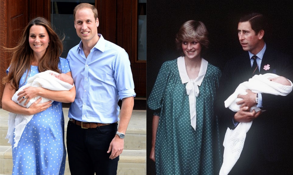 The Duchess of Cambridge wearing a polka dot dress by Jenny Packham while carrying her new son, Prince George, in 2013; The Princess of Wales, Diana, presenting Prince William to the world in 1982.