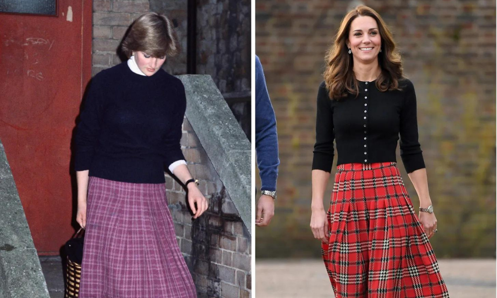 Princess Diana is seen wearing a festive printed skirt and black pullover; Duchess of Cambridge similarly wears a festive long plaid skirt and black cardigan while arriving at a Christmas party at Kensington Palace in 2018.