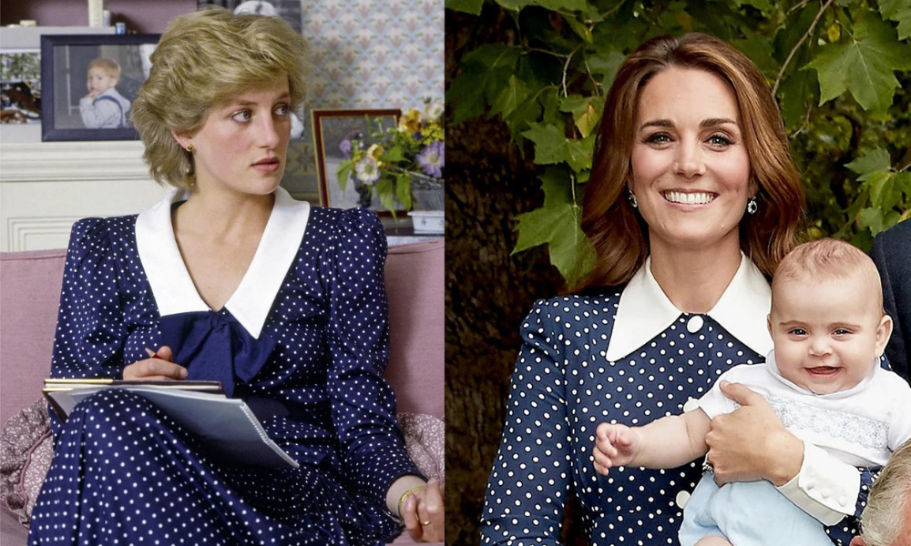 Princess Diana, seen photographed at home in 1985; the Duchess of Cambridge wearing a similar polka dot, white-collared Prada dress in Prince Charles’s 70th birthday portraits in 2018.