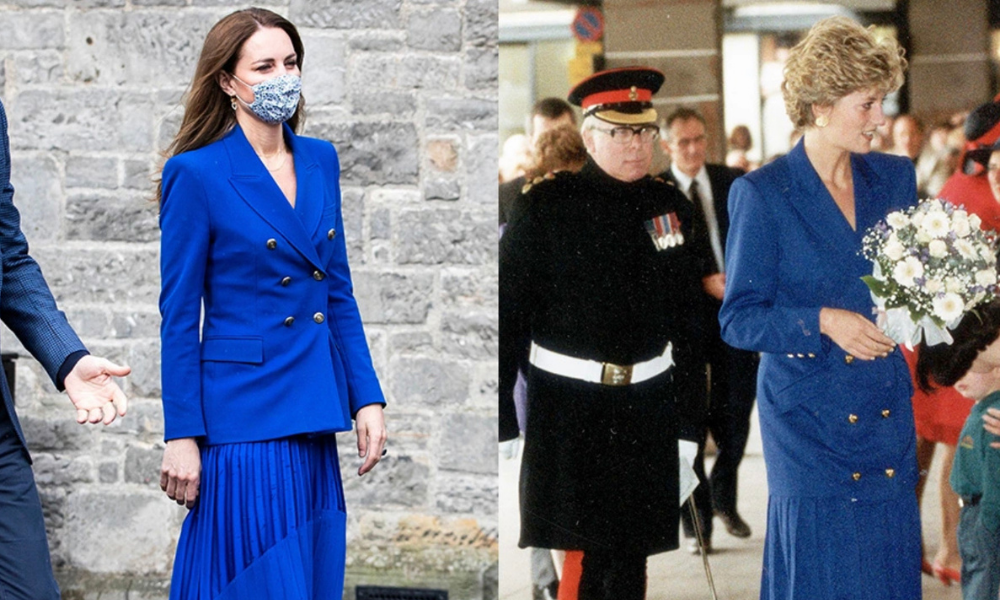 Princess Diana was spotted pairing a blue blazer with a matching pleated skirt; Kate Middleton mirrored her look while visiting Scotland in May 2021.