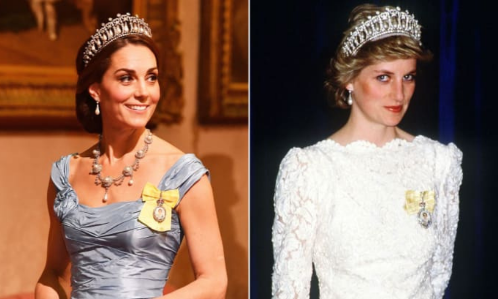Kate Middleton wearing the Lover’s Knot tiara for a state dinner in 2018; Princess Diana wore the same tiara while attending a dinner at the British Embassy in 1985.